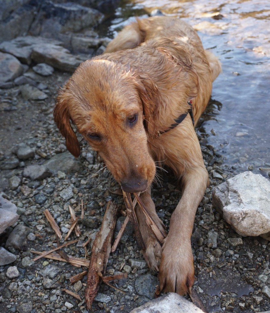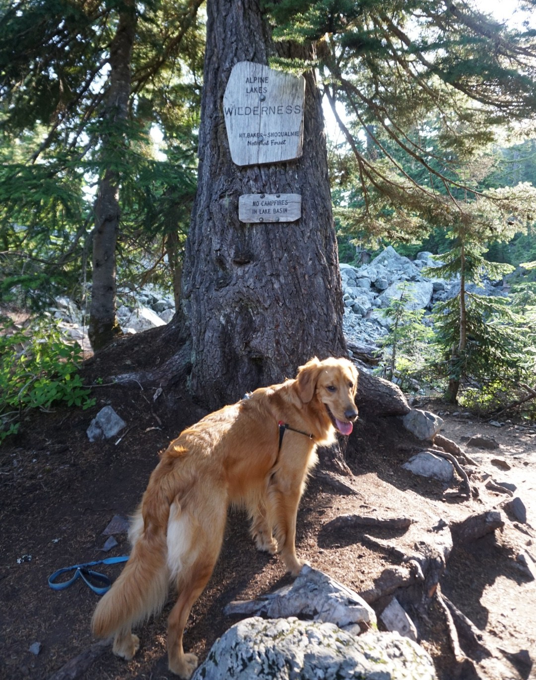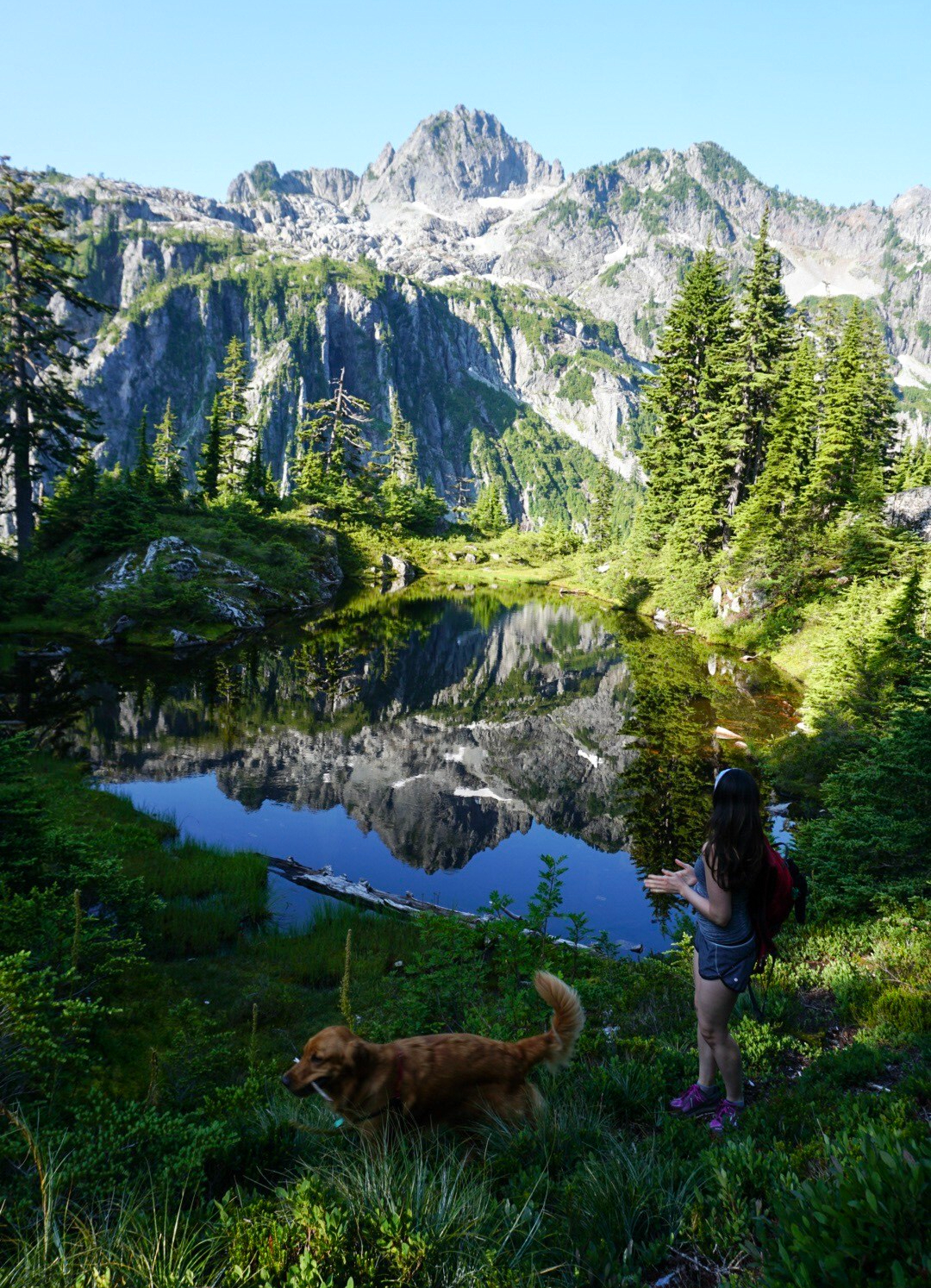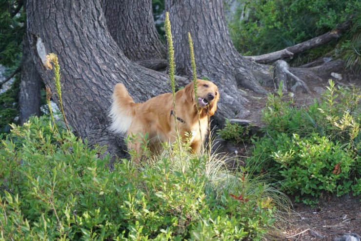 Past Snow Lake you’ll follow a clear trail up a ridge eventually traversing a large talus slope until you arrive at the pristine Gem Lake. Moose went for a swim and found more sticks to chew on.