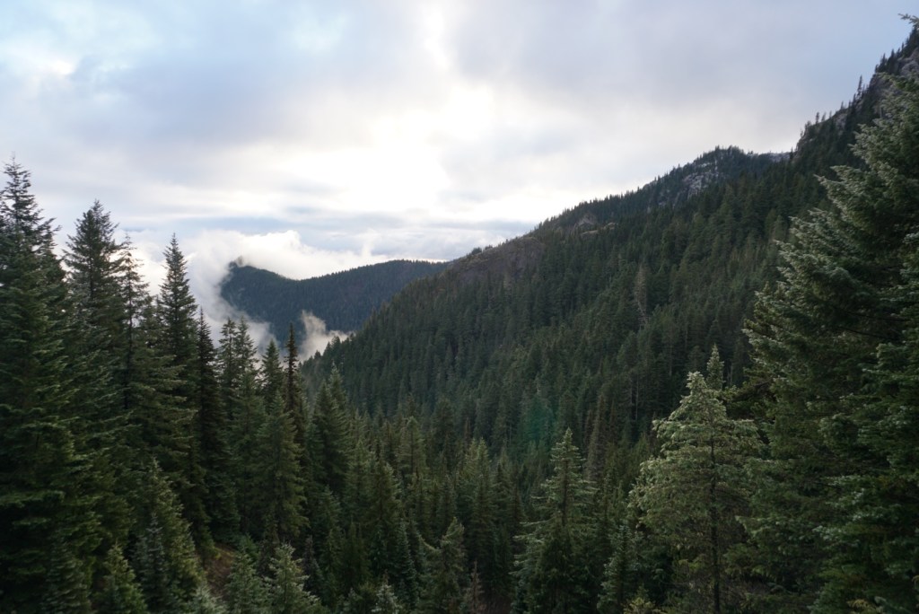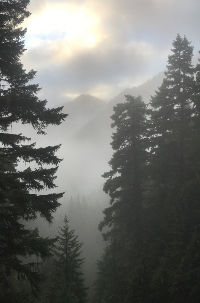 An hour into the hike the sun rose and lit up the foggy old growth forest!