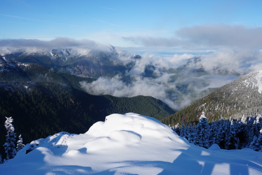 As we descended the long summit ridge the clouds parted and gave us a look into the Olympic Mountains! We stopped at the saddle at 6,000ft and enjoyed the views we were afforded! We had so much fun playing in the fresh snow and it was simply gorgeous!