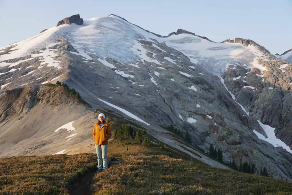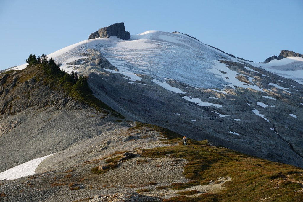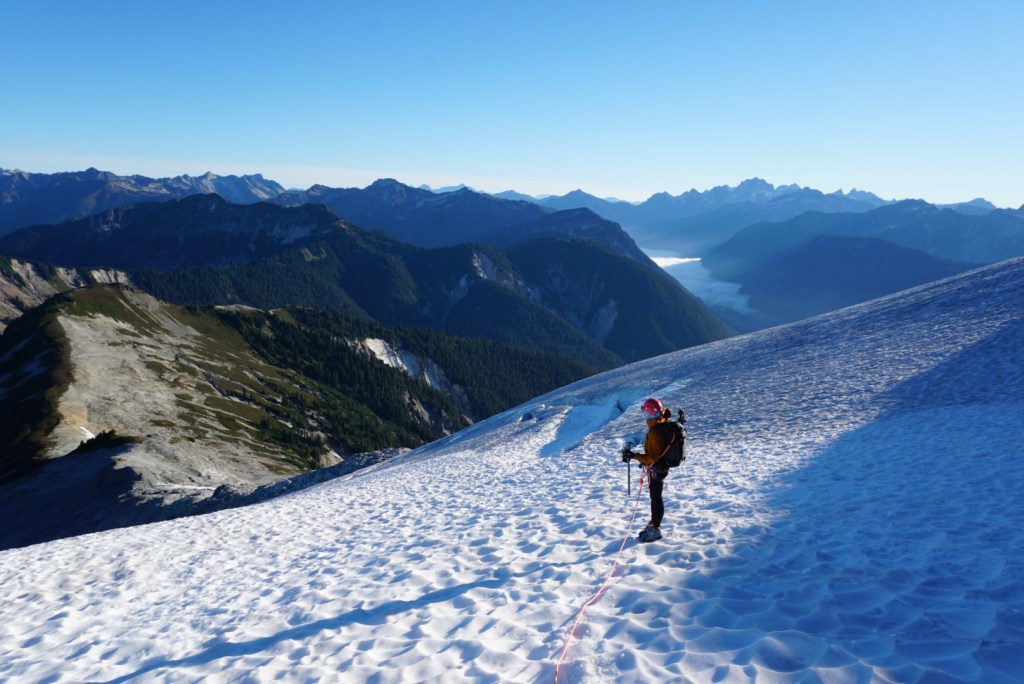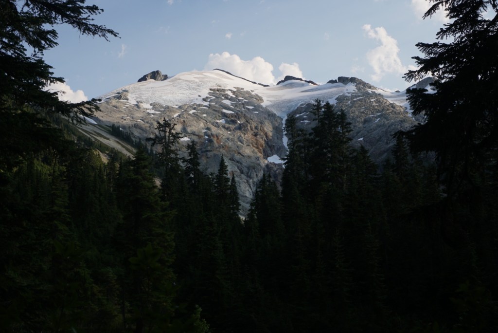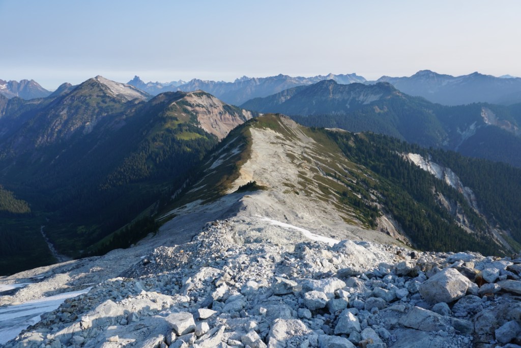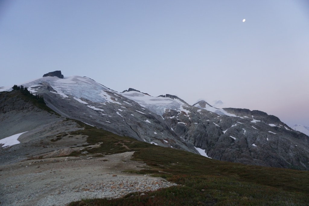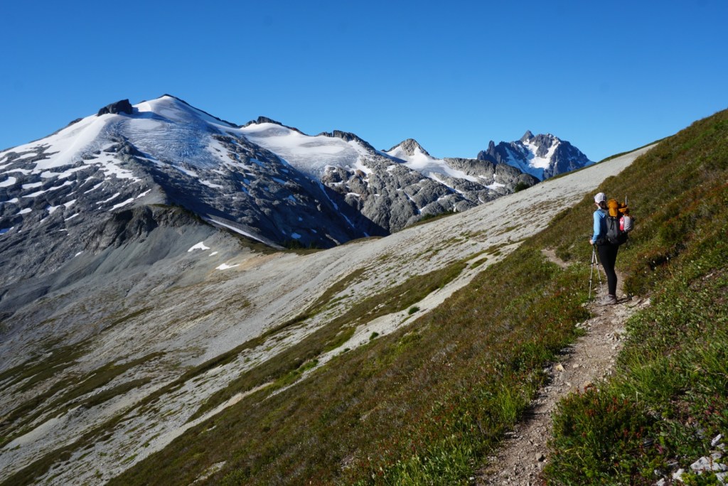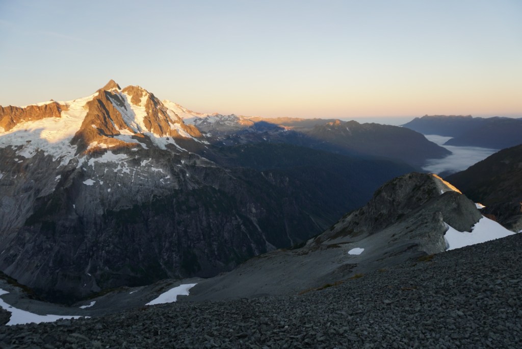 After Hannegan Pass we needed to use some veggie belays during a short and steep section. After topping out the trail flattened and the light really started to get nice.