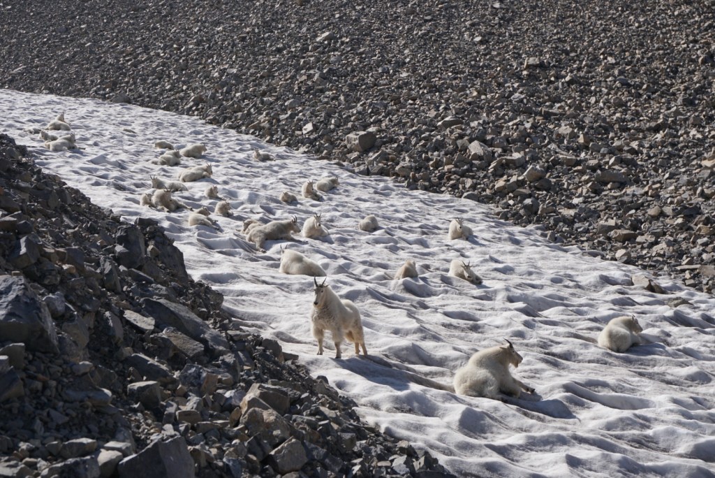 Instead of back tracking I sent it directly down the glacier which is just a rock-covered mass, currently with lingering patches of snow. Apparently there still is a glacier buried beneath the talus. The sun cups in the snow made it easy to get down quickly until hitting the rolling hills of talus. Near Emerald Lake I had to do a double take as I noticed the snowfield moving. It was a herd of mountain goats!