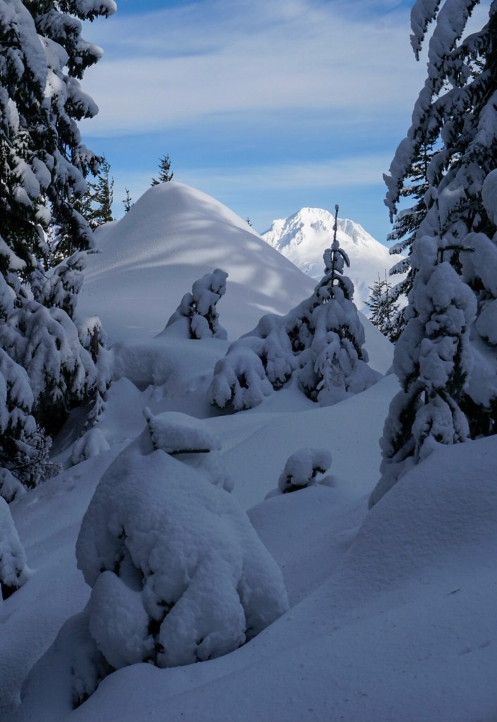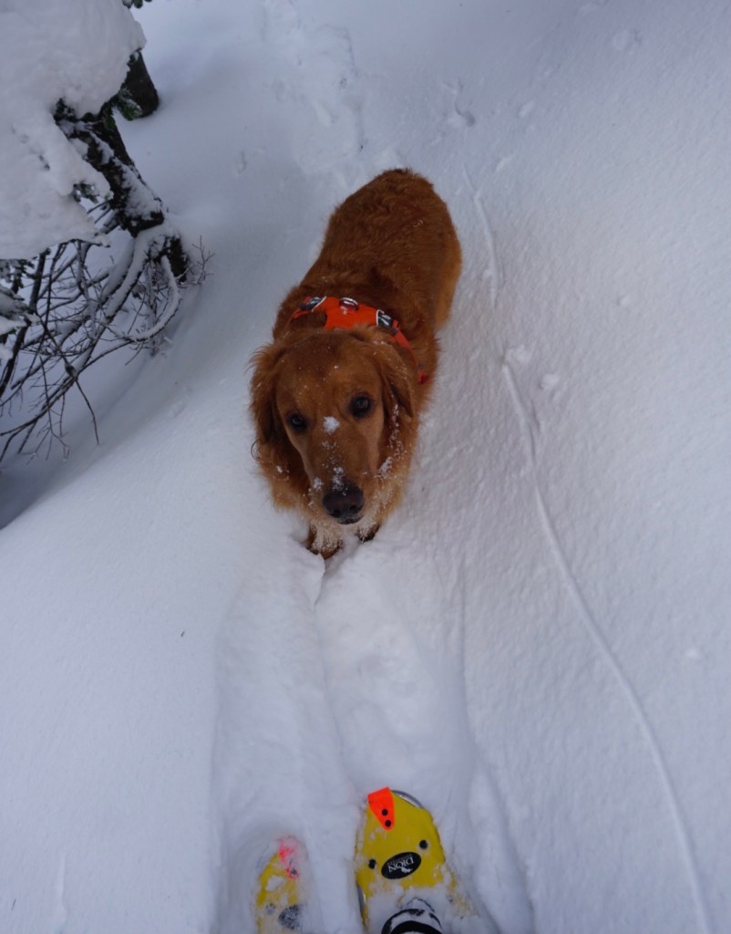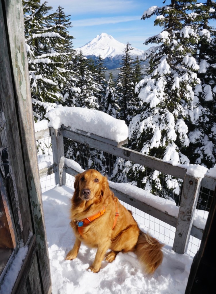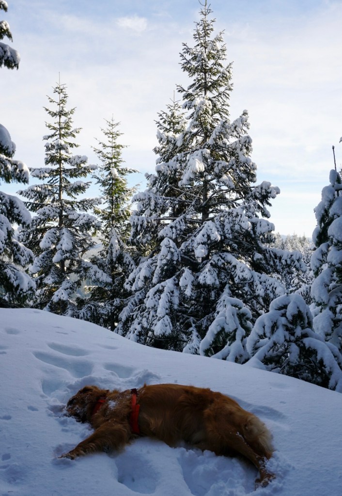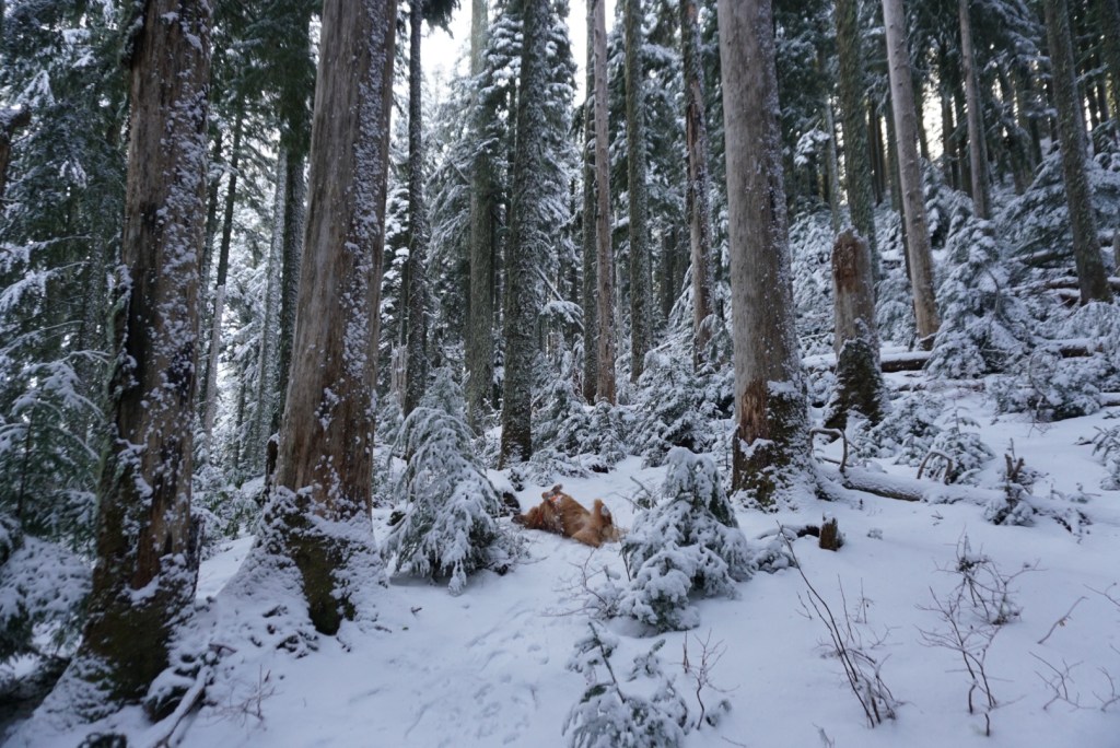 Moose and I beat the ski crowds out to Rhododendron, Oregon and the Cool Creek trailhead on a perfect Saturday morning after a few days of heavy snowfall. The trail is consistently steep all the way to the summit but we took plenty of stops to roll in the snow. There are also a few breaks in the old growth forest that offer sweeping views requiring more stops!