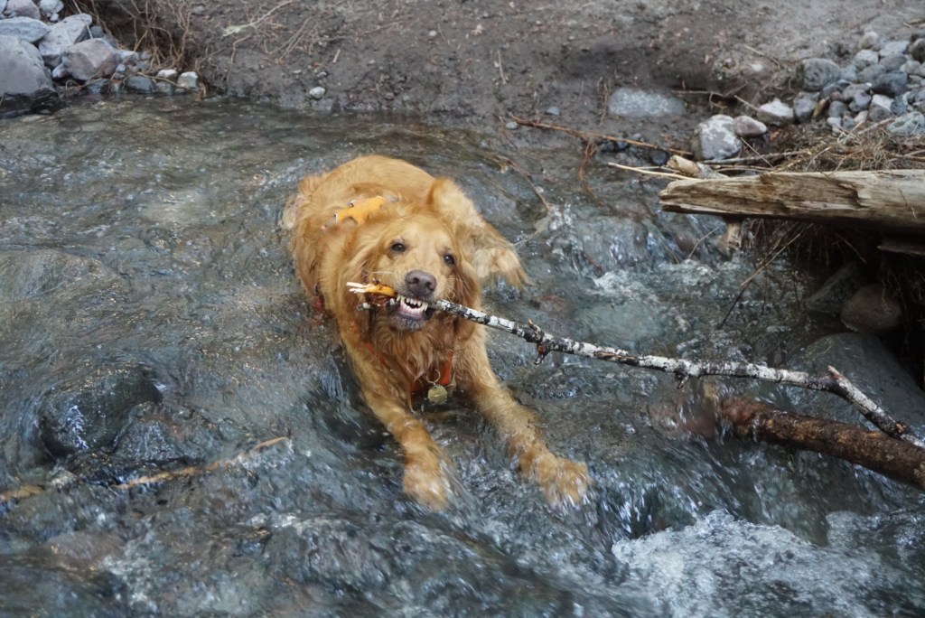 Before reaching the lake the trail to Grizzly Peak veers off to the right crossing some streams for Moose to cool off in. It’s then a gradual climb for 2.5 miles to the summit. We took extra water breaks to combat the heat.